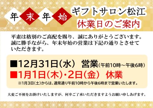 (午前10時~午後6時) - 2026年1月1日(木・祝)、2日(金)は休業日とさせていただきます。